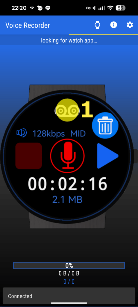 スマホ版の Voice Recorder を起動し、右上の “時計” アイコンを押して、左下に “Connected” と表示されれば、FIT4 の Voice Recorder と連携が完了しています。