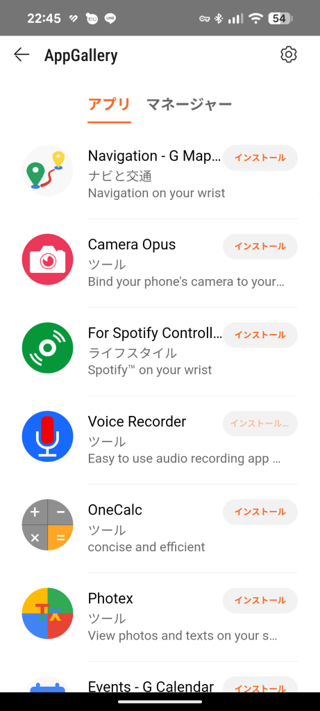 スマホ上でアプリ「HUAWEIヘルスケア」を起動し、”デバイス” ⇒ “AppGallery” を選択、アプリ一覧から “Voice Recorder ” を見つけて、インストールします。
