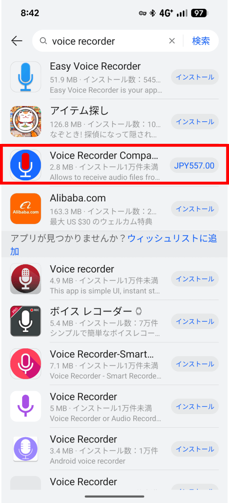 AppGallery を起動し、”Voice Recorder Companion” でアプリを検索します。似たようなアプリがでてきますが、アプリの開発者は “Mobimax” です。